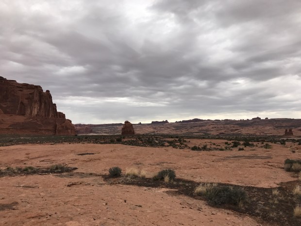 Looking back across the slickrock towards the rest of the park. Park Avenue, Balanced Rock, and Devil’s Garden are all visible!