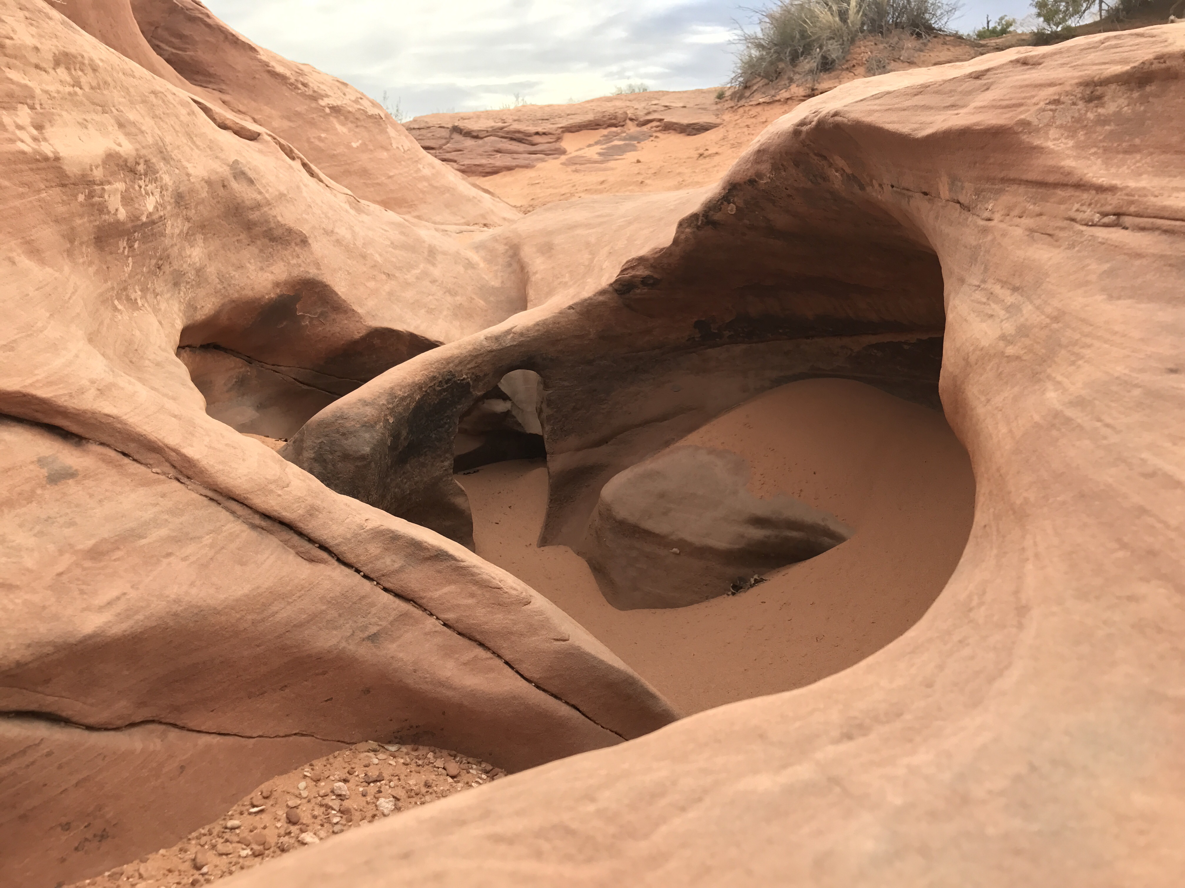 I followed the border fence for a ways, before striking out on the slickrock and transitioning to sand dunes and back again. This would be the general theme for the day- rocks and sand neither did well by my feet. The rock is easy to walk on, but pounding and the sand gets into everything seeping through my shoes and into my socks where it grinds between my toes and under the ball of my foot. I stopped 5 or 6 times today just to empty all the sand out.
