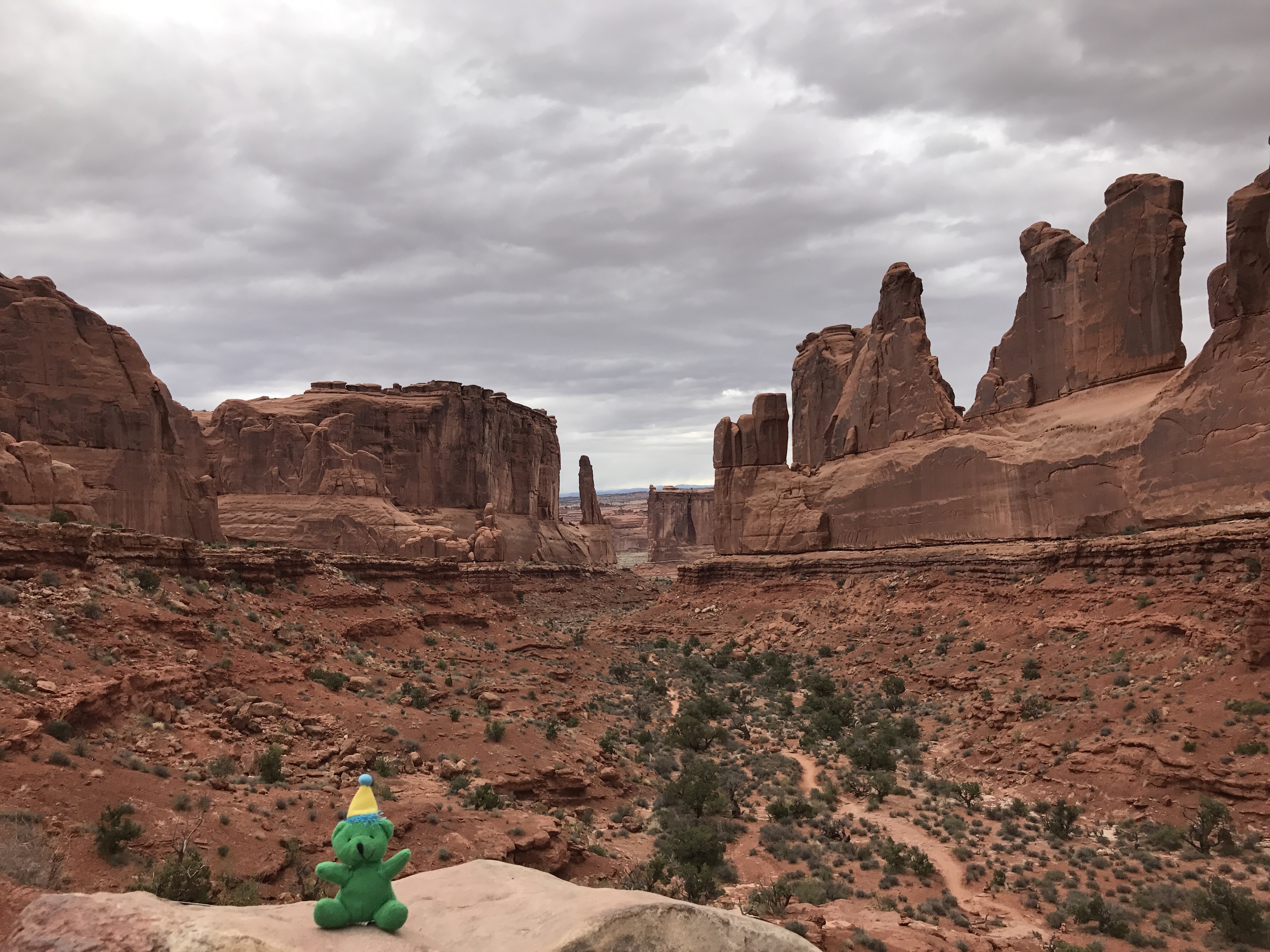 Looking back across the slickrock towards the rest of the park. Park Avenue, Balanced Rock, and Devil’s Garden are all visible!