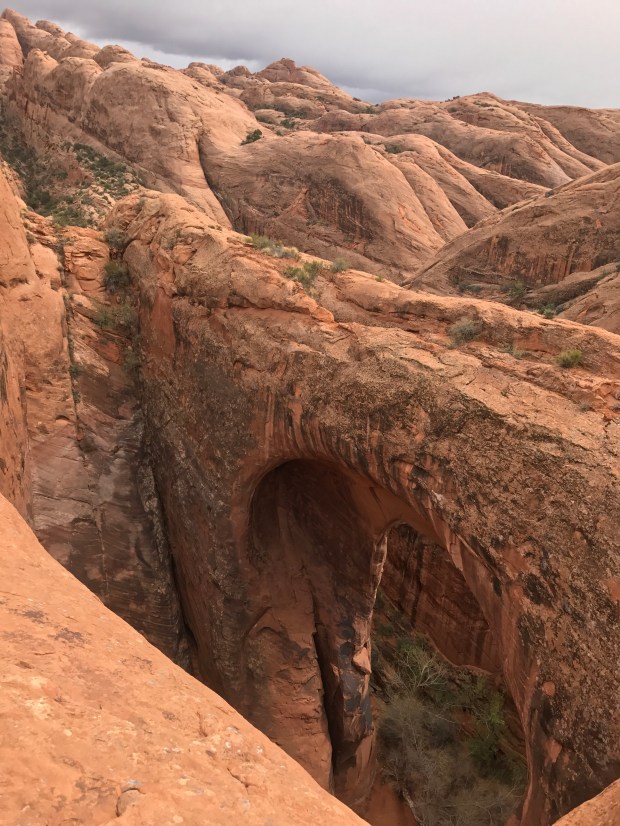 But I enjoyed the adventure of it, and got to see so many fabulous things! At least one other group of people has done the route recently too because there were some freshish tracks I was following. There was a beautiful Arch that I passed too: Pool Arch. You look down on it from above, and the rappel anchor nearby signal that folks rap down through it!