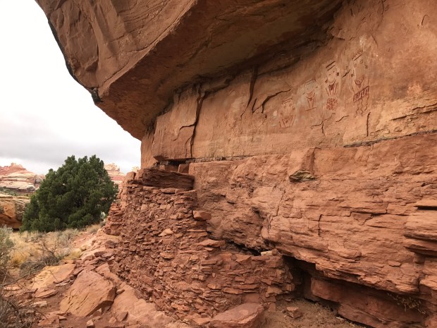 After the creeks Upper Jump, the narrow winding canyon opened up and the creek began running through beautiful open green meadows which allowed easy visibility to all the archeological sites along the walls. All over the Upper Salt Creek Valley are remnants of the Ancestral Puebloan peoples (they’re also known as the Anasazi, but that’s a name taken from the Navajo meaning “Ancient Enemies” which isn’t well reflective of the people). The Ancestral Pueblo culture developed over time in the Four Corners area with its peak from about 700-1300 AD. During that time they built massive cities like Mesa Verde and many other elaborate dwellings and structures. The two main things I saw in this area were granaries, where they stored their food, and rock art- sometimes both in the same place!