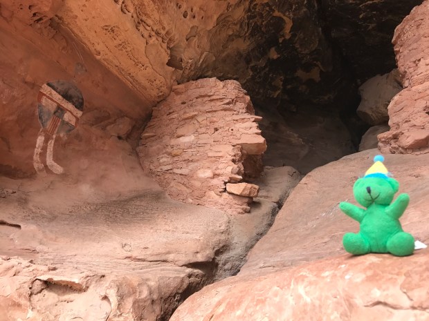 The most incredible thing though was the All American Man, a pictograph painted high in an alcove of a man holding a red white and blue striped shield. It’s one of the most famous ones in the area. There’s been debate about if it’s authentically Native, or an elaborate 19th century cowboy prank, but the general scholarly consensus is the color pigments and style too closely match other verified Ancestral art in the area for it to be a fake.
