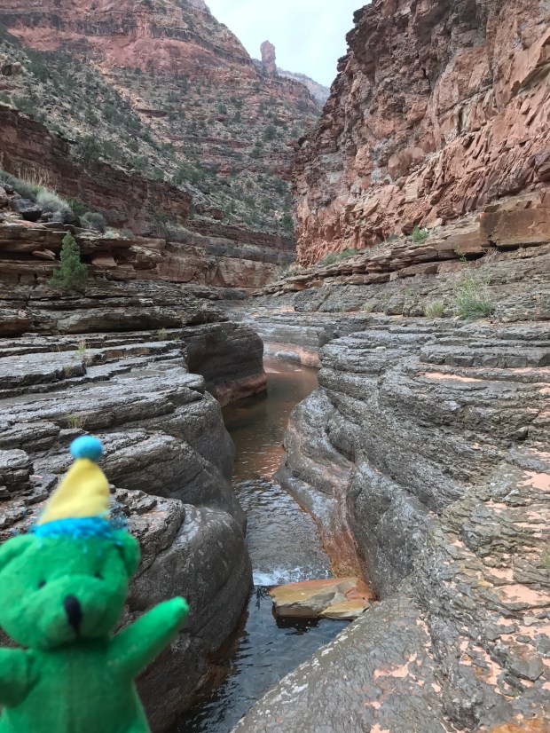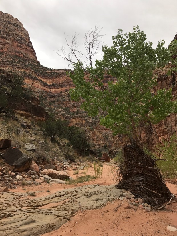 The trail didn’t follow the wash, but rather went through each of the spits of land between the twists and turns of the canyon. At first these started off pretty flat, but as the canyon began closing in the spits started getting steeper and steeper to go up and down. As the canyon continued to narrow, water appeared for the first time too! First in small pools and then as a continuously flowing creek which the trail kept flipping across- except for the one spot that necessitated going through. I tried so hard to keep my feet dry! There was lots of vegetation too, and many trees covered in debris from flash floods.I had a cold lunch by the confluence with Youngs Canyon, where the guidebook trail rejoins. And from there it was an awesome hike through the rest of the canyon. The walls were narrow enough now that we tended to stay on one side or the other usually a ledge or two above the creek. It was pretty nifty walking!