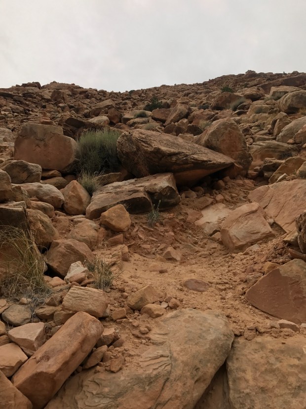 I loved skipping back and forth down the canyon ledges and staring up at the massive walls above. Eventually the path led up and out of the canyon on the Sundance “Trail”. I put trail in quotes because I don’t know if I’d actually call it one. It’s basically a 1200 foot scree field that happens to have a couple cairns here and there.