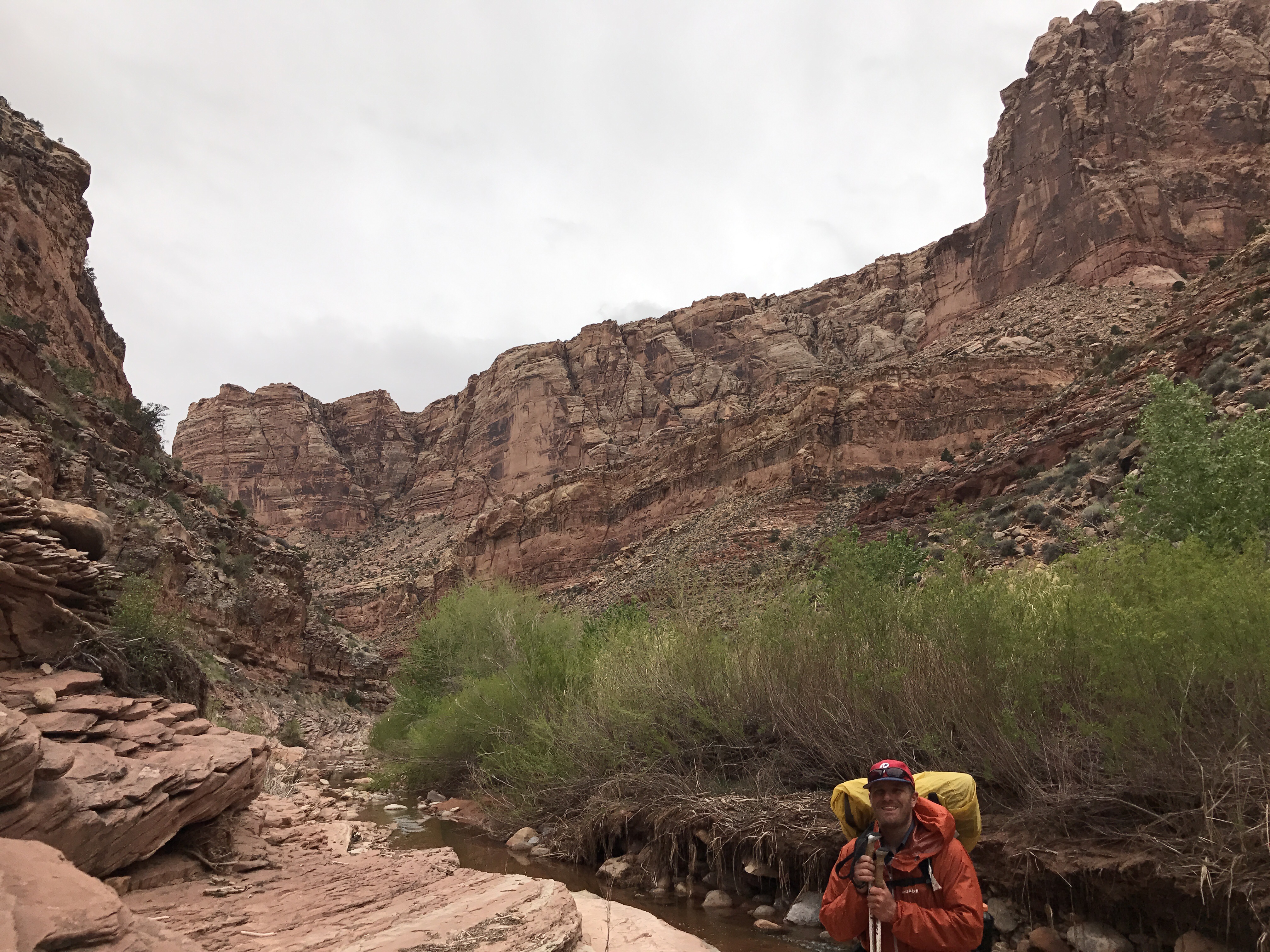 The trail didn’t follow the wash, but rather went through each of the spits of land between the twists and turns of the canyon. At first these started off pretty flat, but as the canyon began closing in the spits started getting steeper and steeper to go up and down. As the canyon continued to narrow, water appeared for the first time too! First in small pools and then as a continuously flowing creek which the trail kept flipping across- except for the one spot that necessitated going through. I tried so hard to keep my feet dry! There was lots of vegetation too, and many trees covered in debris from flash floods.I had a cold lunch by the confluence with Youngs Canyon, where the guidebook trail rejoins. And from there it was an awesome hike through the rest of the canyon. The walls were narrow enough now that we tended to stay on one side or the other usually a ledge or two above the creek. It was pretty nifty walking!