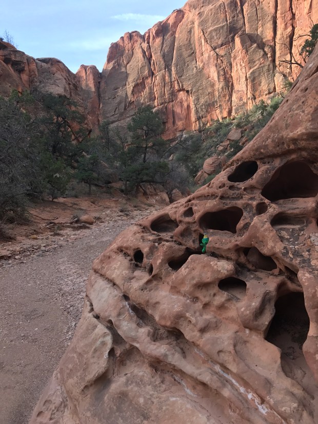 The trail traverses the entire length of this canyon twisting and winding around the folds. I really enjoyed just being able to take it slow and look and around. Because of the high walls direct sunlight didn’t even enter the area until after 10am, and even then only in short patches, which kept the temperatures down, too. One thing I noticed were lots of little holes in the canyon walls that form almost like a spiderweb maze of connections.