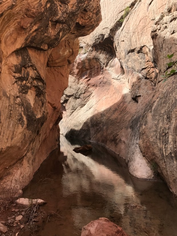 I wade back into the water one more time to pick up the cliff bar floating on the water’s surface that I’d forgotten to remove from my pocket (I realized later that I most have lost another one to the bottom of the pool too) and started the descent back to the main route. I was wet, but fortunately not cold. I was definitely a little shaken. It has me nervous for upcoming slots, and looking ahead to the Grand Canyon plunge pools….it’s just so hard to gauge water depth. At the same time I couldn’t help but thinking that my friend Bubbles probably would have loved it. (and made it to the Arch)