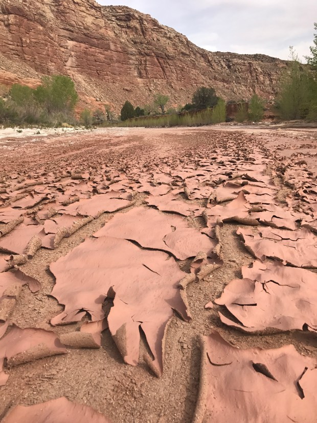 The Fold now stretched to my right and a huge cliffband stretched to the left, but the valley floor was much wider and the walking still was super easy. Halls Creek eventually would start flowing in the bed, but to start it was dry. I really enjoyed the crackling pealing dry red mud through much of this section.