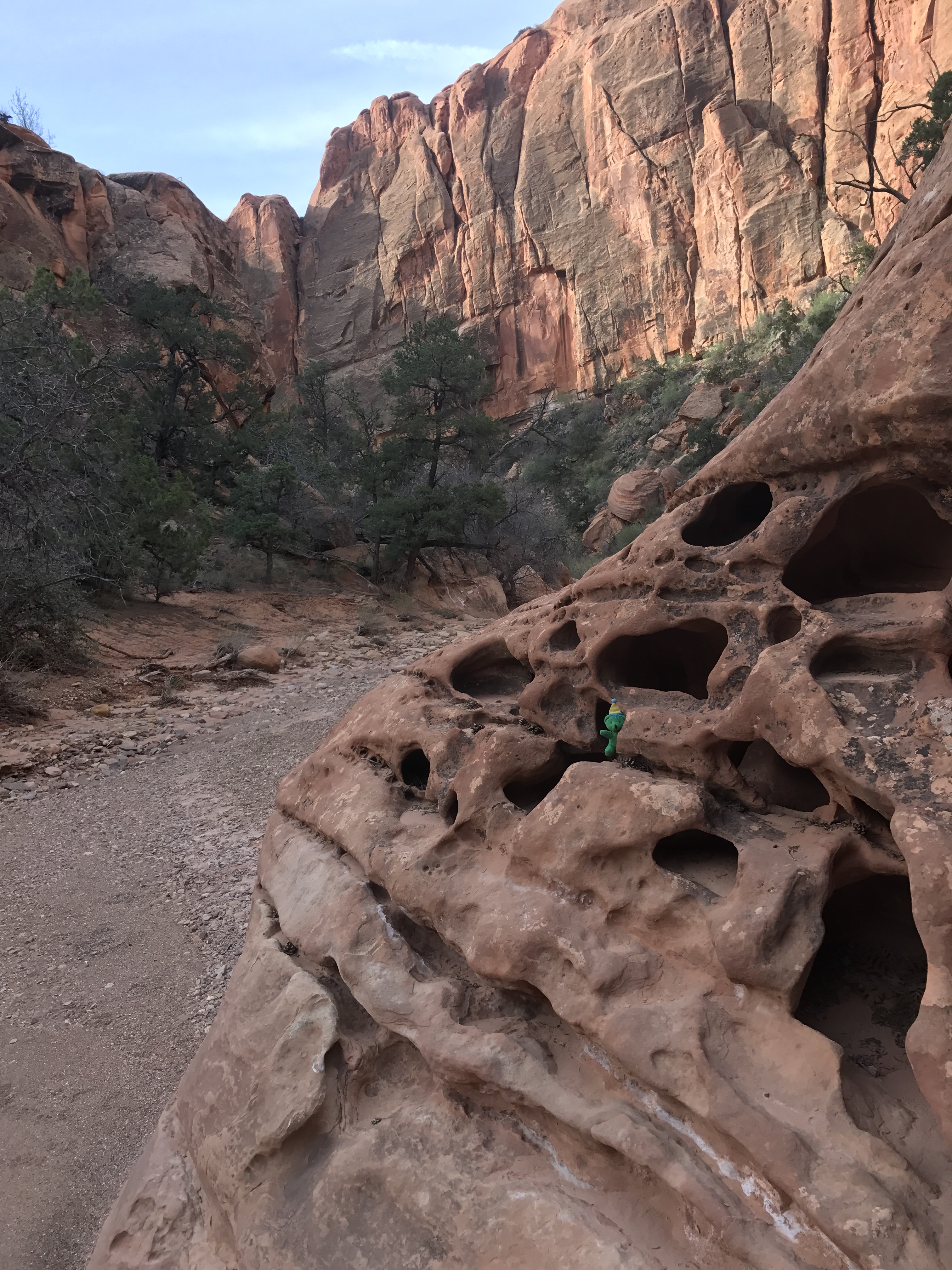 The trail traverses the entire length of this canyon twisting and winding around the folds. I really enjoyed just being able to take it slow and look and around. Because of the high walls direct sunlight didn’t even enter the area until after 10am, and even then only in short patches, which kept the temperatures down, too. One thing I noticed were lots of little holes in the canyon walls that form almost like a spiderweb maze of connections.