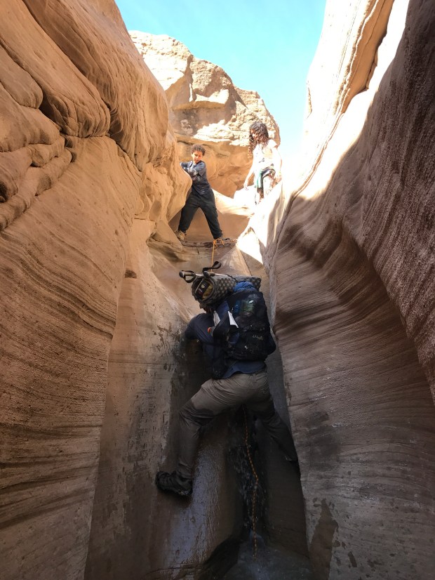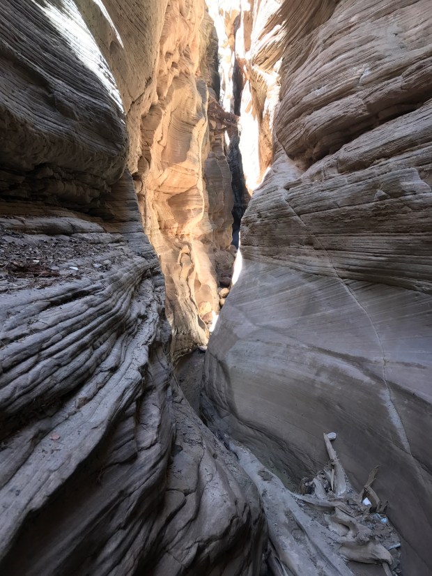 Finally about 3 miles in the Canyon narrowed considerably and then slotted up. It got pretty narrow at times. I was climbing up the canyon, instead of down like in Round Valley Draw, so I’d have to scramble up and over some rock fall occasionally. This got tricky because of all the extra mud I was carrying on my shoes. The canyon floor wasn’t too bad, but one muddy step is all it takes to lose friction on your shoes as you try to climb.I kept going, finding a spot where someone had bolted a climbing rope to the wall to help get up. I was super thankful it was there! I heard some echos up canyon and around a bend was met by a father and two teenagers from Sacramento. We were just about to pass under the Skutumpah road above and they told me to take a close look as I passed under. There was an old pickup stuck in the canyon walls!