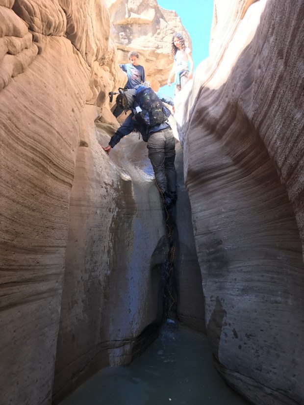 Oh my goodness! So I had to go back through my photos because I totally didn’t recognize the spot with the rope in your photo. When we went through there was a) no water flowing down that drop and b) no rope because there was a big ol’ log situated vertically in that slot that we could easily climb up. Amazing how different things can be! Also, great photo of the truck!! Glad you got a chance to rest up in Cannonville!
