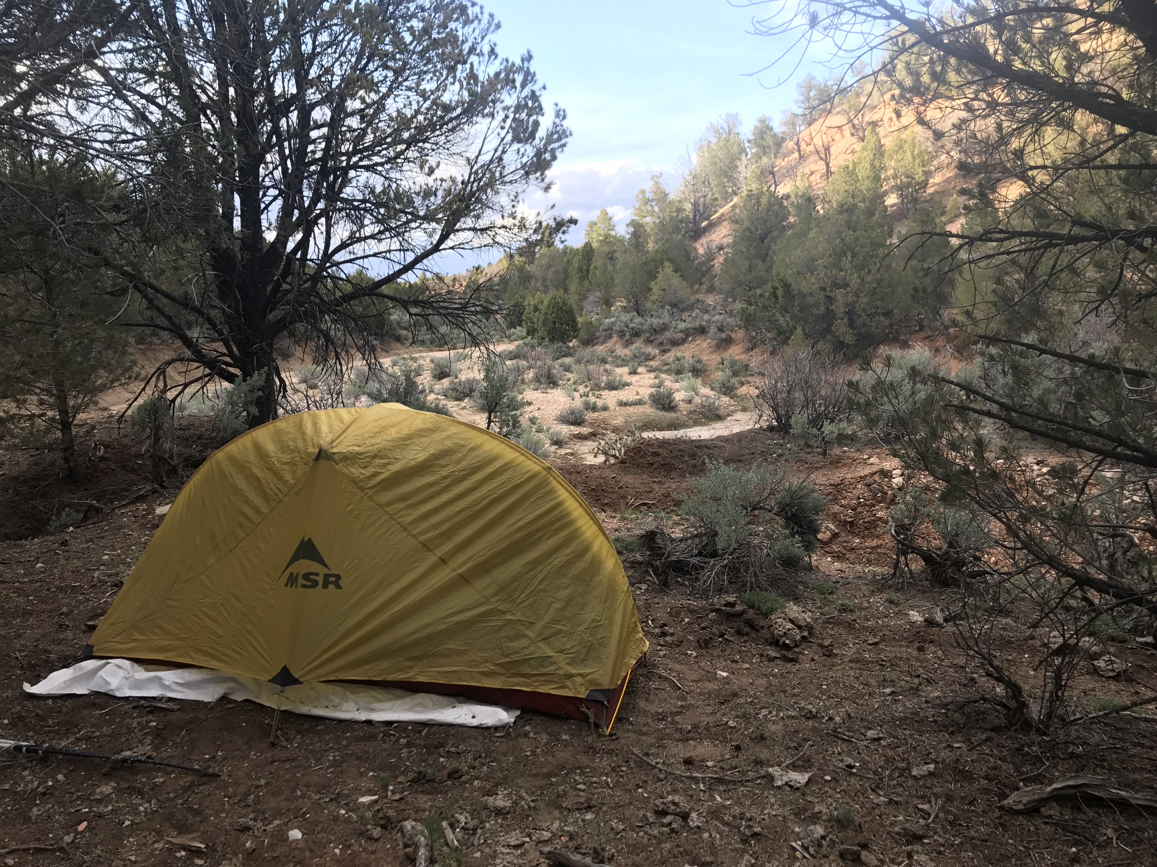 When I finally arrived there I took a cold and very windy lunch in the information kiosk. I even put on my puffy while I ate! Just as I was packing up, the park geologist came up and announced he’d be giving a geology talk in a few minutes, so I plopped back down and stayed. He talked about the Grand Staircase. I wish I’d taken notes because he did a great job explaining the geologic history behind each of the different layers, which were old seabeds, which deserts, which dinosaurs or giant crocodiles or sea creatures lived in the different layers. It was really nice. My favorite line was (paraphrased) “So Bryce Canyon isn’t actually a canyon but a naturally eroding and receding Plateau. But Naturally Eroding and Receding Plateau National Park doesn’t sound quite as nice. So we’ll stick with Bryce.” He also pointed out that from where we were standing we could see three of the five! The pink cliffs, the grey cliffs, and the white cliffs. My lazy and informative lunch over I returned to the trail where it descended down to Riggs Spring. The worst part was the snow in the beginning- long stretches of it. Once I dropped in elevation though everything was pretty easy. 4.5 cruisy miles to the spring and then continuing past it I picked up an old jeep track that took me out of the park. Once out of the Park it was more jeep road following on something called the Great Western Trail. Not really sure what that is but the trail wasn’t all that nice even for a 4×4 road. I intersected with Skutumpah Road again which led me into the final mile down Bullrush Gorge- back in the sandy wash bottoms again. Out of the park also means I’m back in cow country again. It had been nice in the park to only need to single treat my water sources. I’m camped in cowpie country (though they’re all old) There’s even a salt lick nearby. Tent went up again for warmth as the weather report called for another low 30s night ( though my water didn’t freeze yesterday, so it didn’t get that cold). Goodnight world! Into Kanab tomorrow!