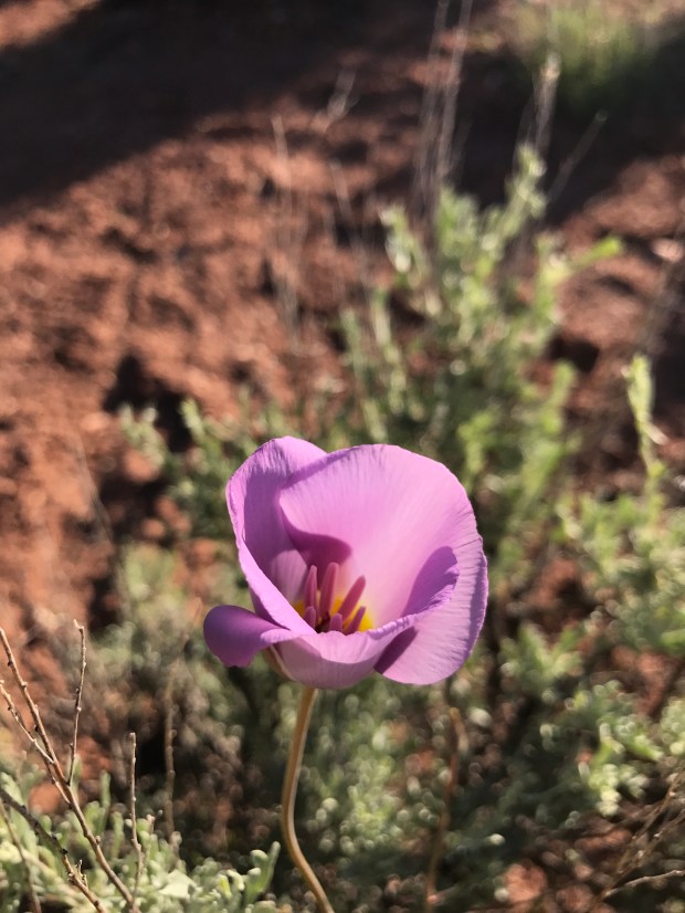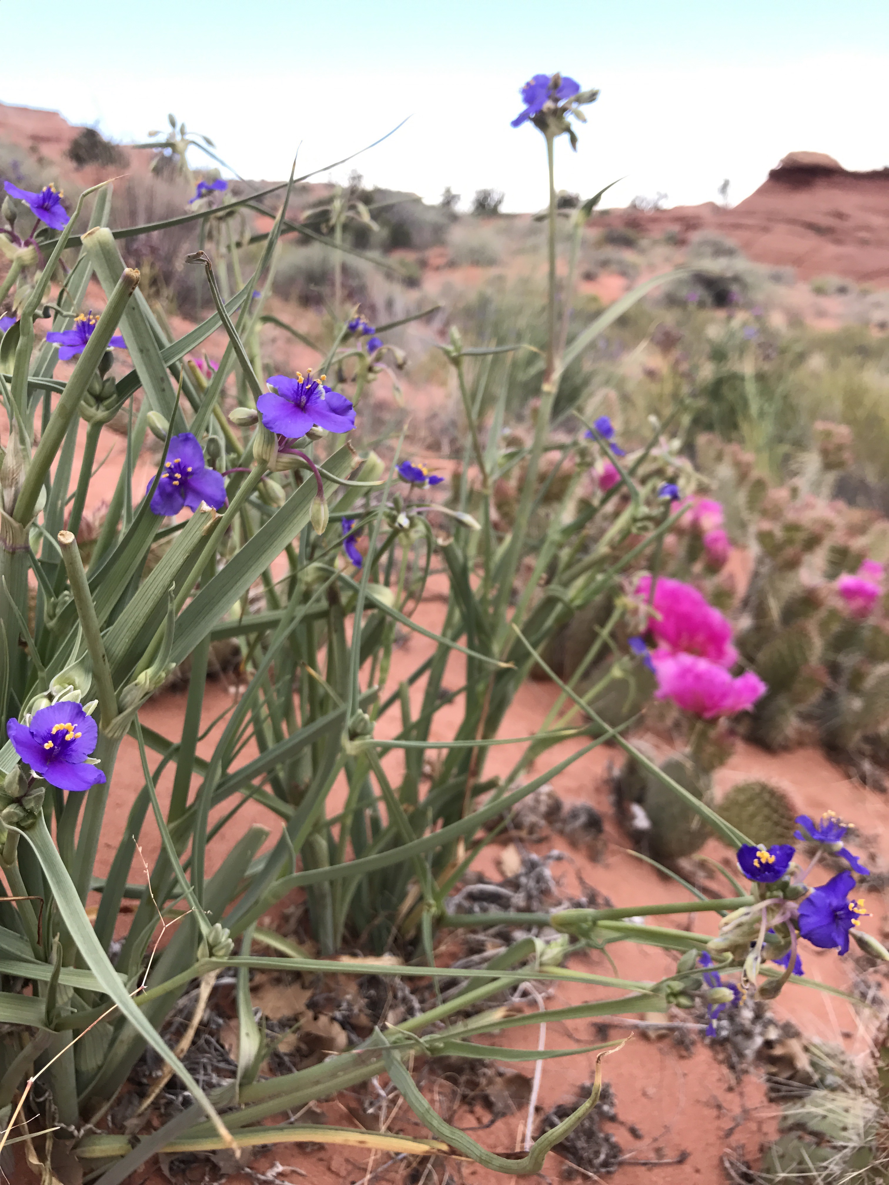 The three-petal lavendar flowers are sego lilies, and the purple three-petal flowers with the grassy leaves are spiderworts. Saw them at Escalante last week. Beautiful.