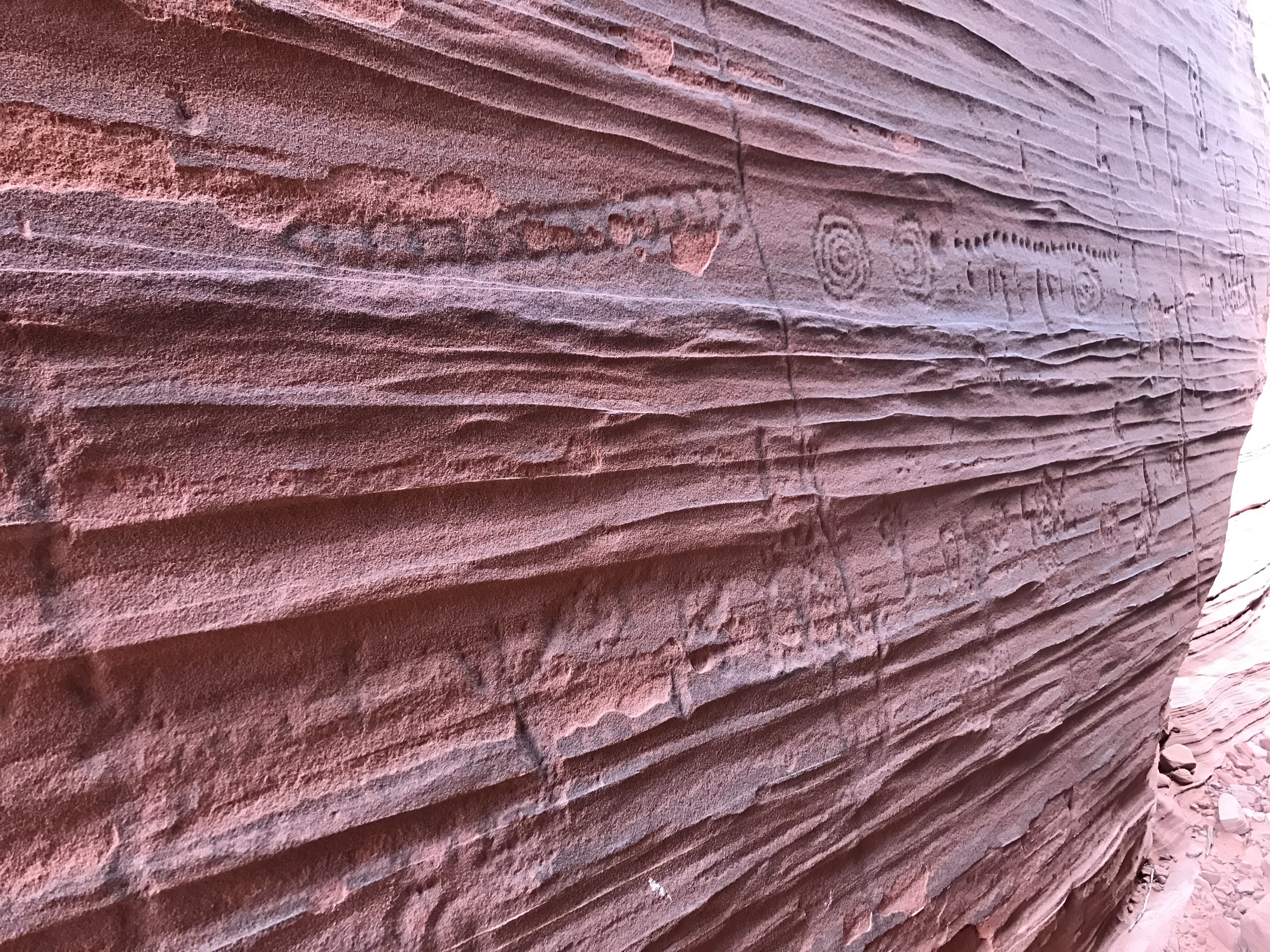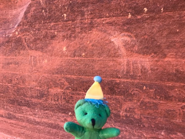 Lydia’s Geopet trying to fit in with the other animals on the Wire Pass Petroglyph Panel