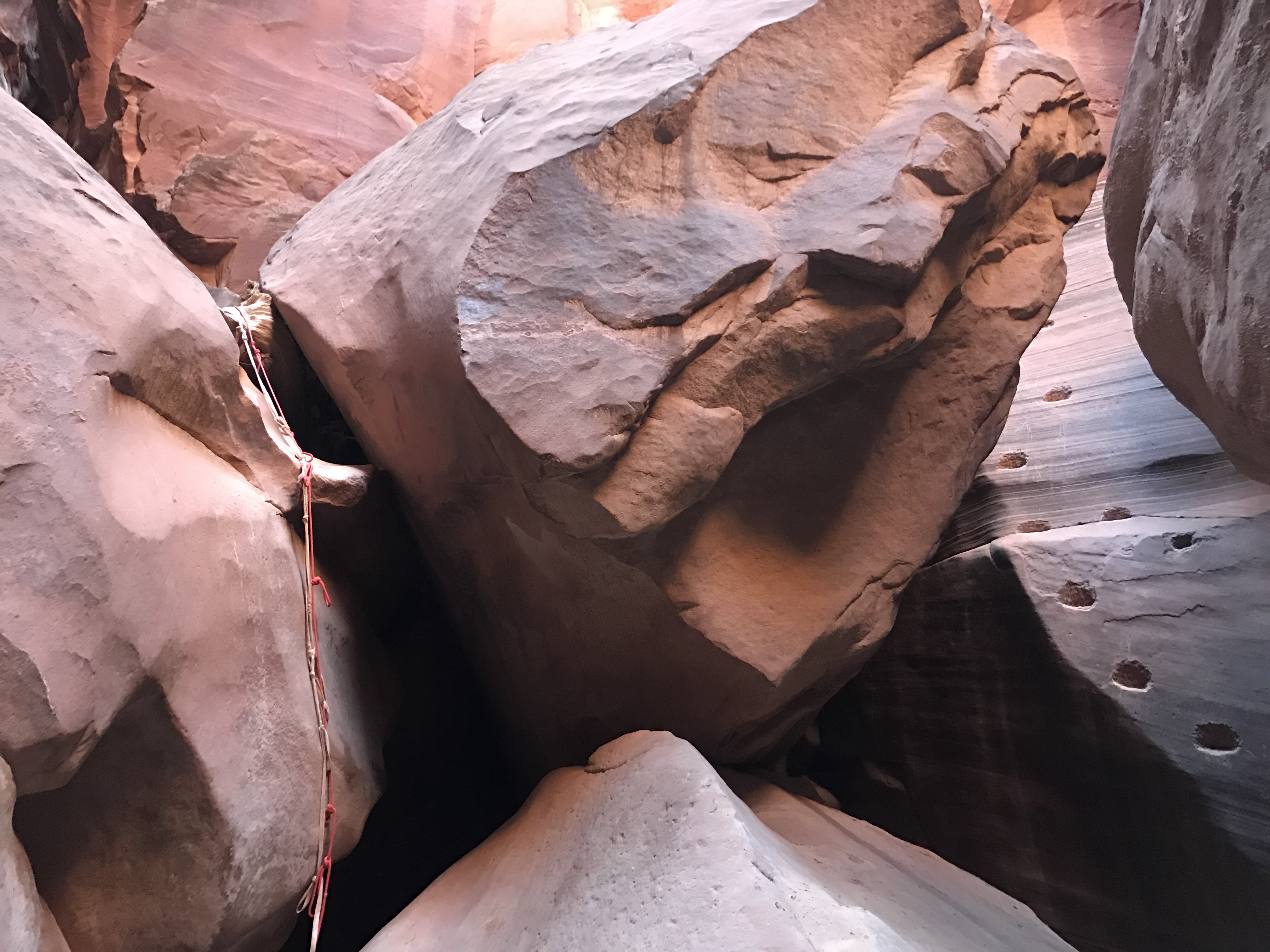 The slot continued to snake its way around, and with no real access to the sun, it was hard to know which direction you were walking. Eventually a short drop off appeared with a choice between a rope or moki steps to climb down: