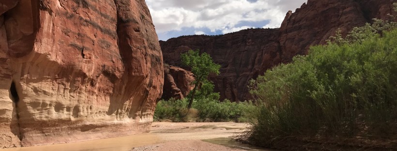 Seventeen miles downstream the Paria went and I followed its windy course. Gone was the wide open braided creek with the multicolored hillsides from further north. Here, the cliff walls towered 2,000 feet high forcing the river into its small channel. Benches and shelves and filled with trees and grasses lined the floor. There were hundreds of good camp sites and flowing springs all around.