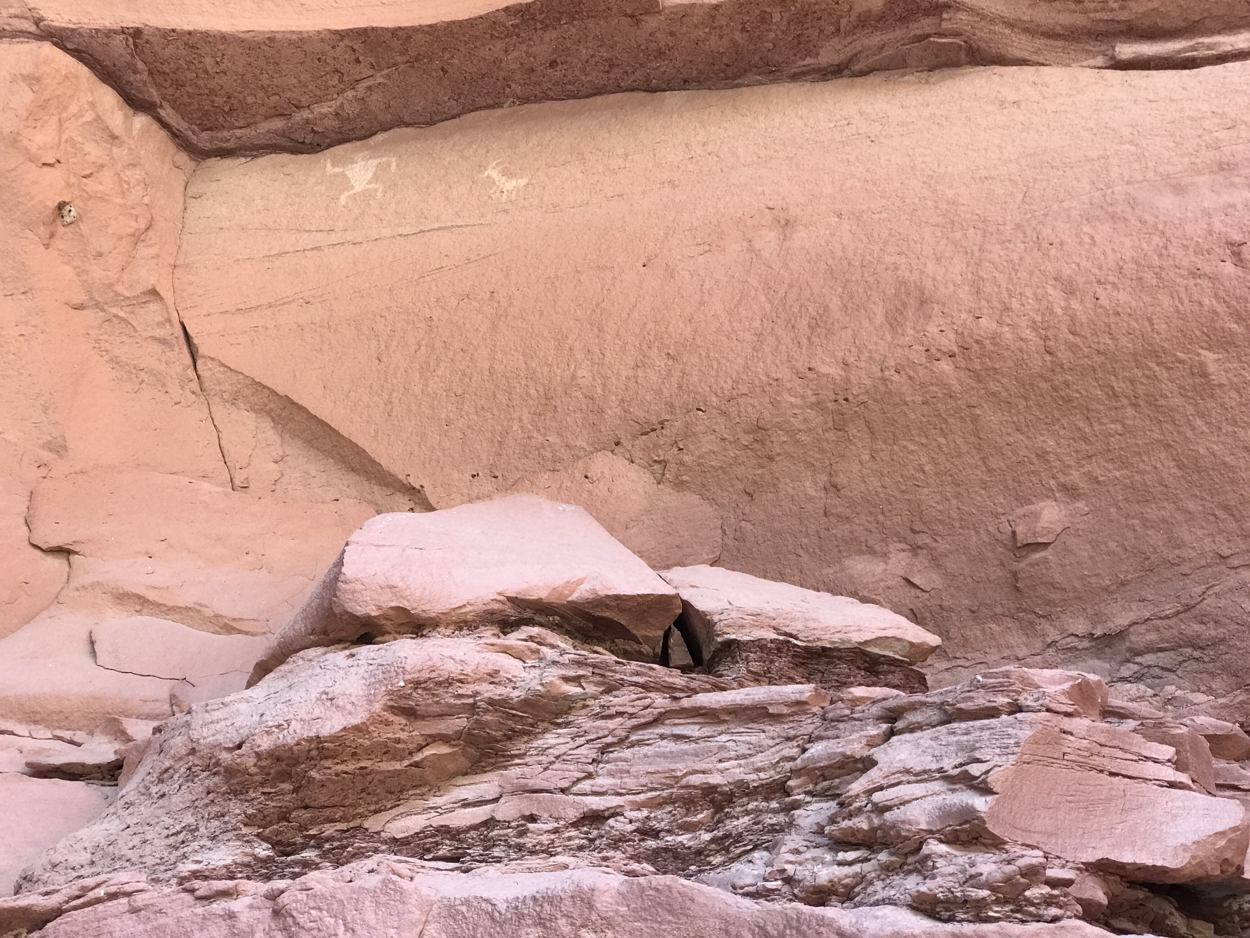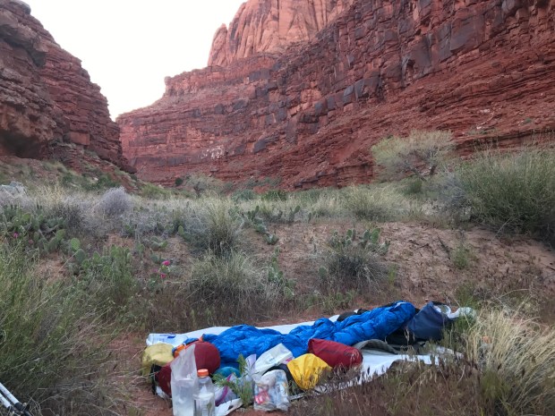 My plan had been to climb out to legal camping today but I’m stopped at the base of the cliff instead. I figured it’d be better to do an 1800 foot climb on fresh legs and dry feet. So I took my time in the last mile looking for a petroglyph panel that I didn’t find ( though I did find petroglyphs!) and filling up my water at “Last Reliable Spring”
