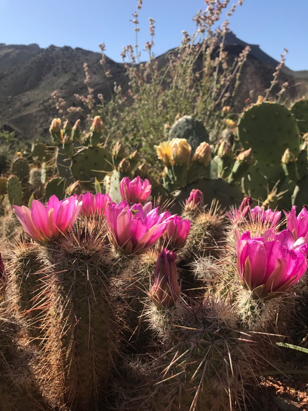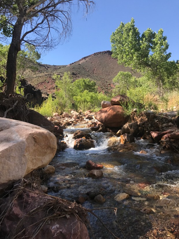 Fields of blooming cactus met me down in the valley floor. And then I was in the sweet cooling shade of the cottonwoods along the banks of Nankoweap Creek. Relaxing and cooling down and refilling my water. I followed the on and off again trail down the creek for 2.5 miles boulder hoping much of the way and met Michelle and Kurt, two day hikers out from their boating group who were on a layover day down at the Nankoweap Campsite.