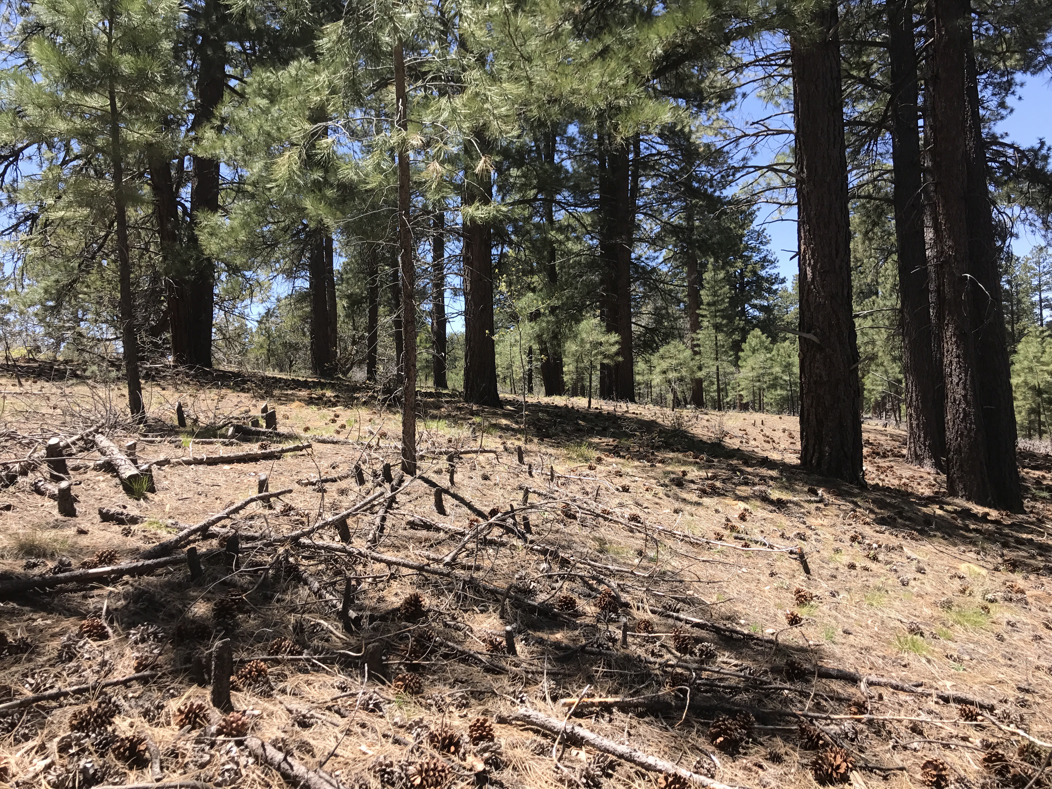 Within the hour I was up top back in the Kaibab Forest surrounded by tall shady Ponderosa, though oddly, someone had been through and cut back all of the smaller ones. An old broken down corral stood not too far away.