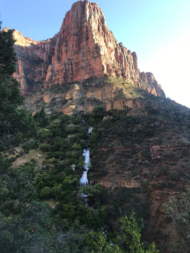 Roaring Springs was pretty amazing. Aptly named, it is really a gushing waterfall straight out of a cave in the cliff face. It provides all of the water for the services in the Grand Canyon on both the North and South Rims though every year rockfall will knock out some of the piping systems forcing needed repairs. This actually just happened recently and some of the North Rim is waterless at the moment.