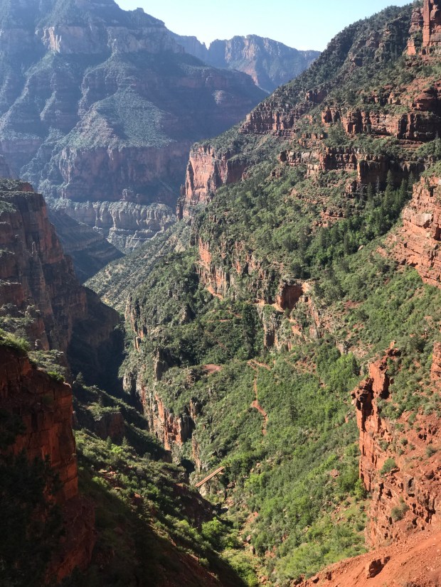 Lush and green and shaded in the morning, the trail was exciting to follow up and watch the vegetation zones slowly change switchback to switchback. I even tried to watch for the changes in rock layers that I learned about in the South Rim exhibits, but I just don’t quite have the eye for that yet.