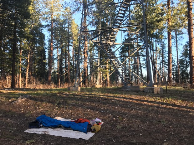 Imagination aside, the cabin was most likely the residence for the person that staffed the nearby fire lookout tower. I pulled off to investigate that too- climbing all 100 steps up only to find a padlock on the floor hatch. The duff beneath still made a great place to set up camp, and there was even a picnic table to organize my things. It’s cold up here tonight. I’m even wearing my gloves for the first time in I don’t know how long. Thirteen more miles of road walking tomorrow. Hopefully it’s a little nicer than today’s.