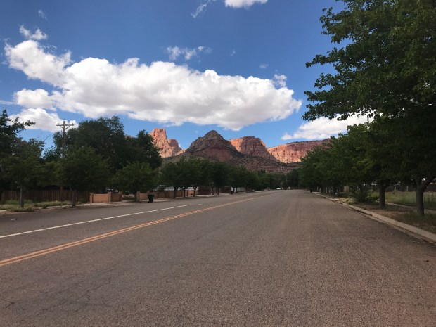 Trees and walled compounds line the main strip of Colorado City.